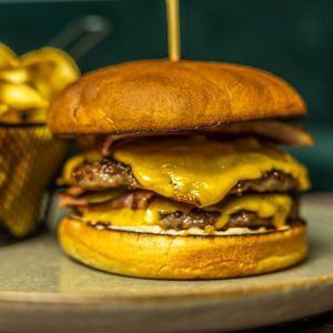 Burgerbrot m it 2 x 180gr.Rindfleisch,Cheddarkäse,knuspriger Speck,Jalapenõs,Essiggurken,Smash-Dip und Crunchy Pommes