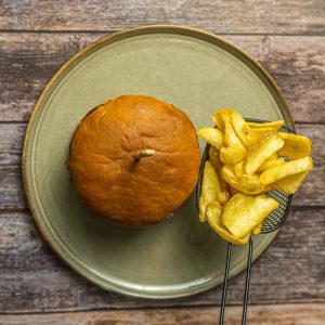Burger bread with 180 gr. beef, lettuce, cheddar cheese, crispy bacon, house sauce, onion and egg with steakhouse fries