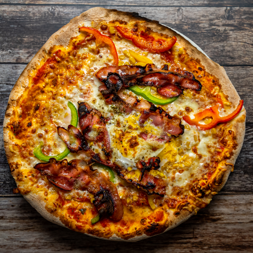 Tomato sauce, mozzarella, bacon, peppers, corn, feta cheese, garlic, egg, oregano