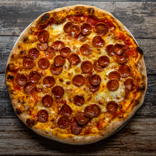 Tomato sauce, mozzarella, salami, corn, garlic, paprika, hot peppers, oregano, hot, mild peppers