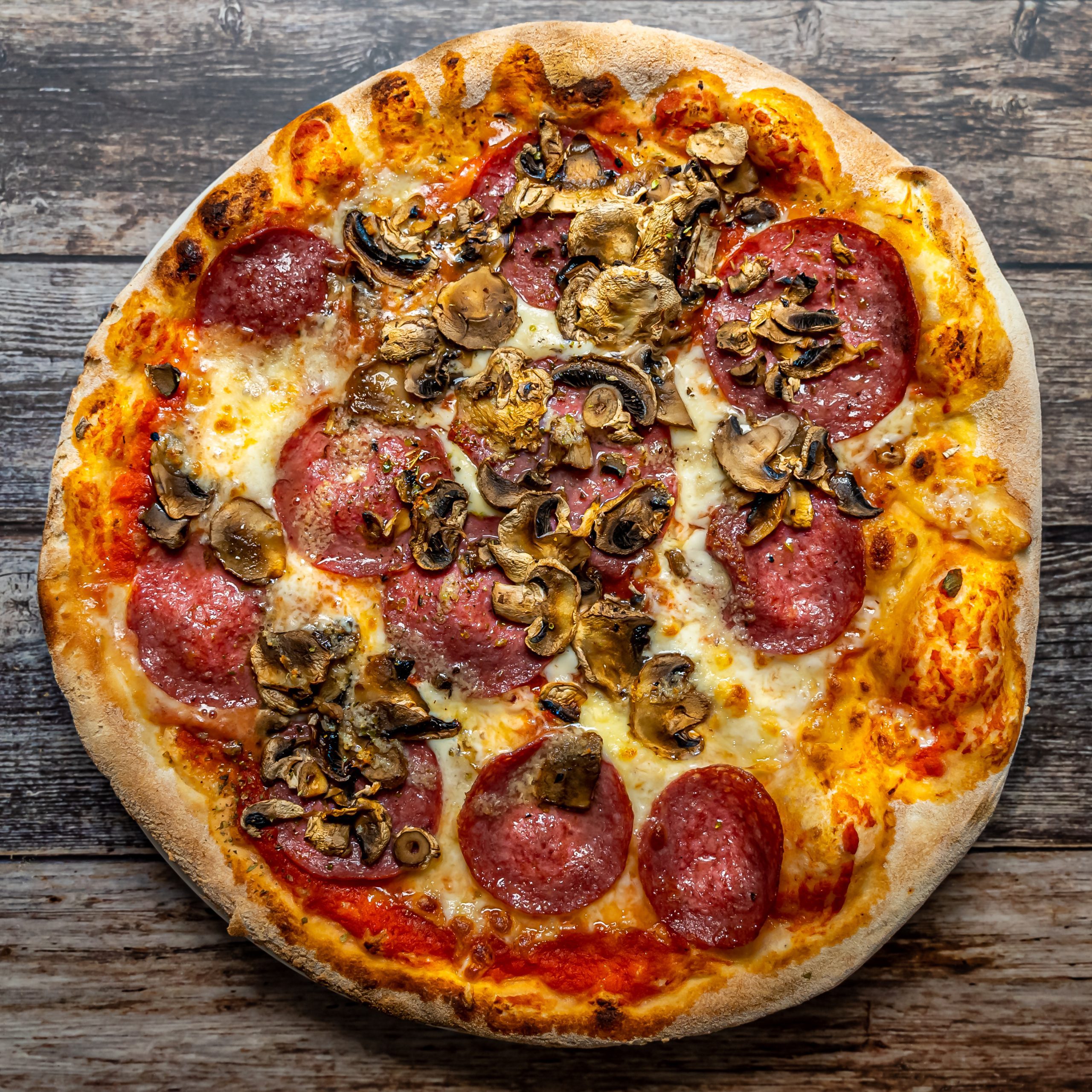 Tomato sauce, mozzarella, ham, salami, fresh mushrooms, oregano