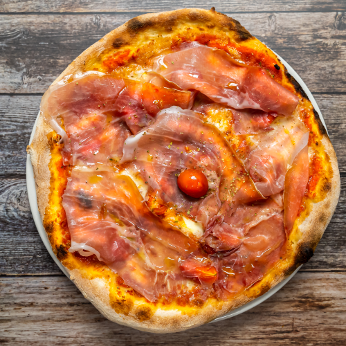 tomato sauce, mozzarella, raw ham, cherry tomatoes, oregano