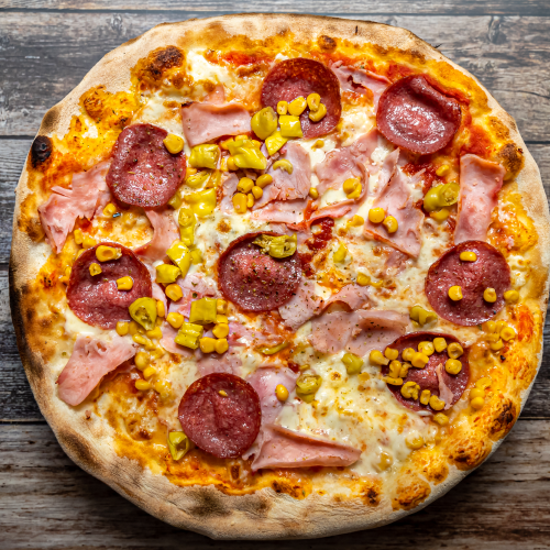 Tomato sauce, mozzarella, salami, ham, mild peppers, corn, oregano